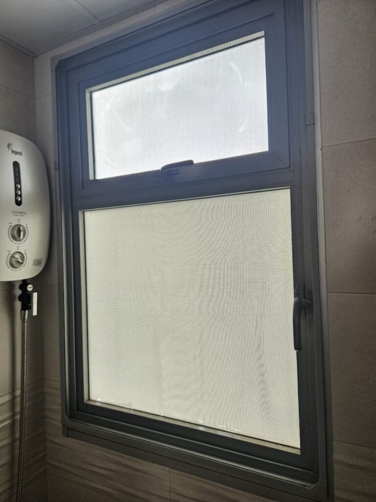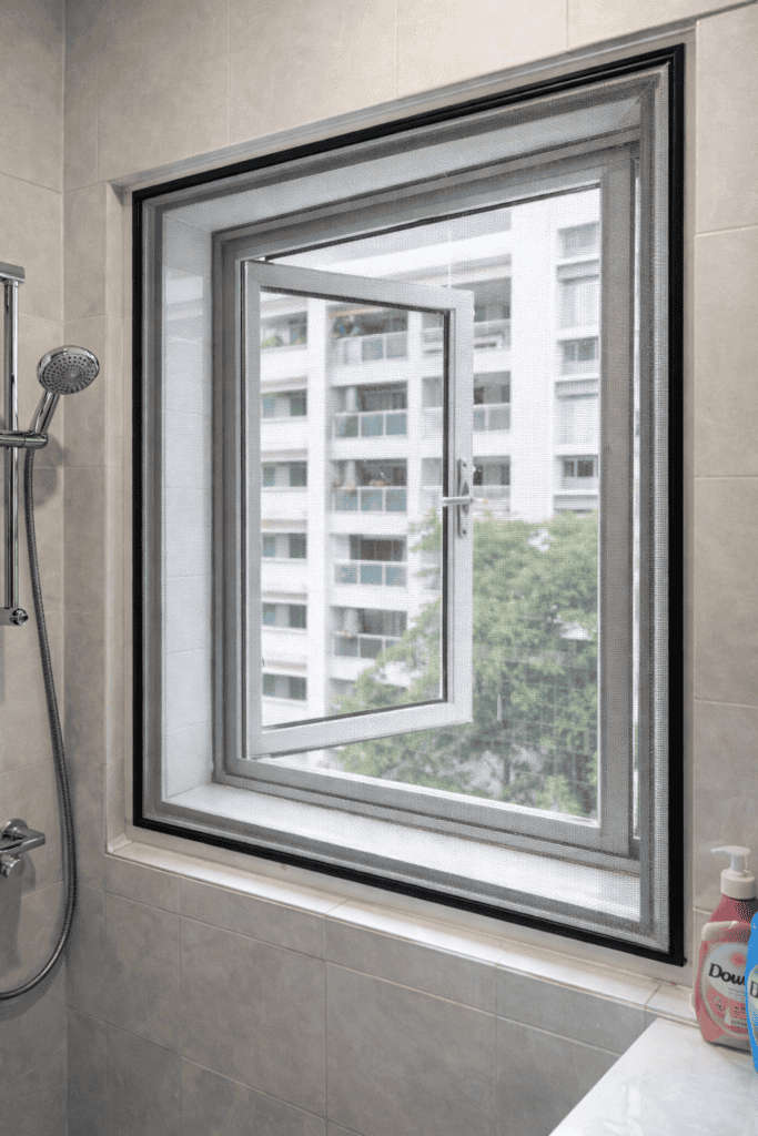 Bathrooms are high-humidity zones, so screens must be fitted neatly and maintained periodically. Our bathroom screen setup is designed to be removable for washing and re-installation, which is important in Singapore’s climate.
